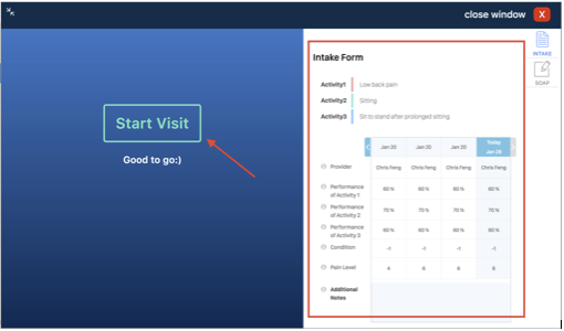 2. Before you begin, you can review Intake Form from your patient on the right side of the screen. When you’re ready, you can select Start Visit button to start the visit.